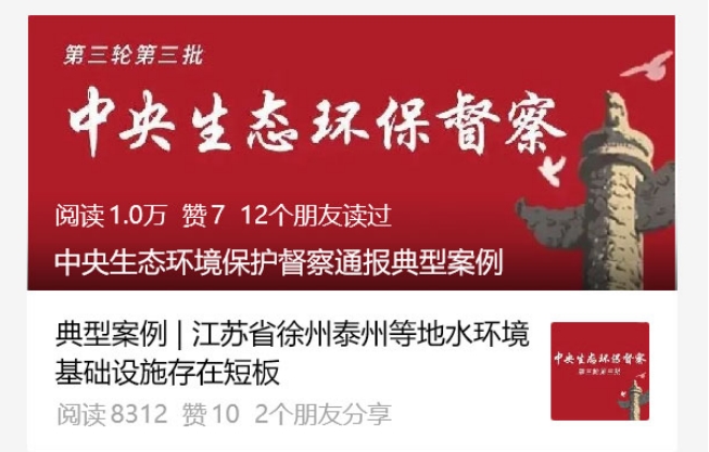 生態環境部11月20日消息,中央生態環境保護督察通報典型案例。江蘇徐州、泰州被點名。 2024年11月,中央第一生態環境保護督察組督察江蘇省...