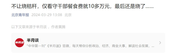 這一消息也引發(fā)了媒體的廣泛關(guān)注。北京青年報(bào)就以《不讓燒秸稈,僅看守干部餐食費(fèi)就10多萬(wàn)元,最后還是燒了……》為題轉(zhuǎn)載了這篇文章。