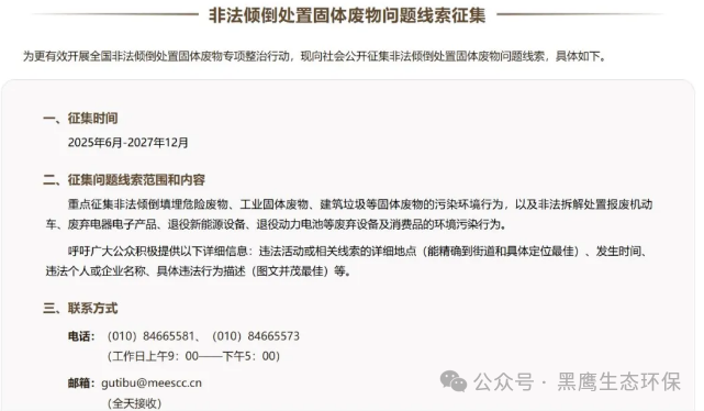 同時,生態(tài)環(huán)境部也歡迎社會各界及媒體朋友積極提供問題線索,并在門戶網(wǎng)站開設(shè)了非法傾倒處置固體廢物線索征集專欄,公開了舉報電話及郵箱。